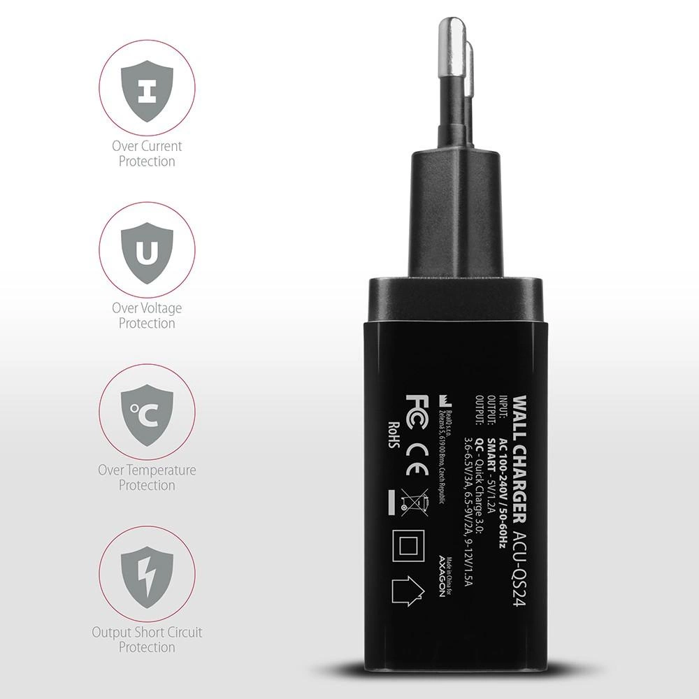 Uniwersalna ładowarka o sieci USB AXAGON ACU-QS24 do szybkiego ładowania aż dwóch urządzeń przenośnych równocześnie.