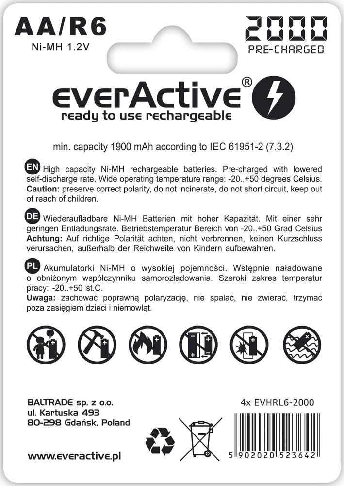 4 x innowacyjny akumulator R6 AA 2000 mAh everActive wykonany w technologii "ready to use". Idealne dla wymagających lamp błyskowych, latarek, reflektorów, aparatów cyfrowych, czy odtwarzaczy CD/MP3. Pojemność akumulatorów everActive jest zbliżona do baterii alkalicznych, ale można je wielokrotnie ładować (nawet do 1200x). Ponadto akumulatory dużo lepiej znoszą rozładowanie dużym prądem.