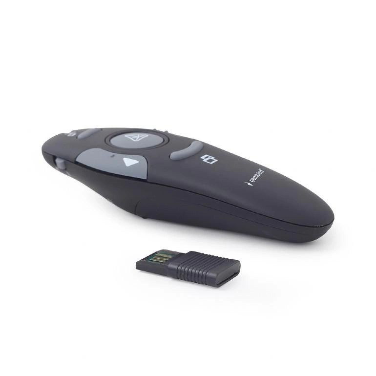 Bezprzewodowy pilot do prezentacji PowerPoint. Czerwony wskaźnik laserowy ułatwiający podświetlenie szczegółów prezentacji dla widzów. 4 przyciski do sterowania najczęściej używanymi funkcjami prezentacji PowerPoint: następny / poprzedni slajd, włączanie / wyłączanie ekranu, wyświetlanie / wznawianie prezentacji, włączanie / wyłączanie lasera. Praktyczny przełącznik zasilania. Plug & Play, bez oprogramowani.