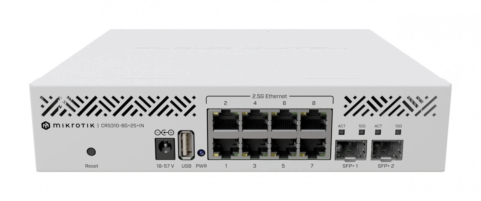 CRS310-8G+2S+IN Skorzystaj z niesamowicie szybkiego połączenia 2,5/10 Gigabit i zmodernizuj swoje miejsce pracy! Ten przełącznik może wykorzystać pełny potencjał RouterOS v7: uruchamiać sieci VLAN, ramki Jumbo, agregację łączy, reguły ACL i wiele więcej!