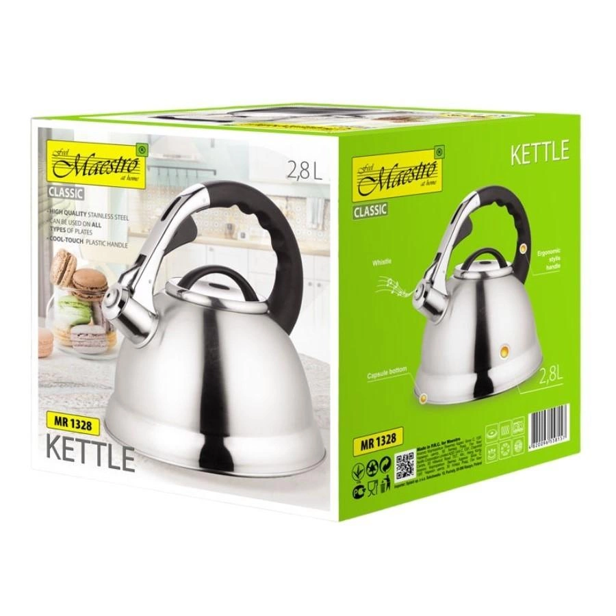 Czajnik nieelektryczny Maestro MR-1328 to elegancki czajnik z gwizdkiem, który wyróżnia się pojemnością 2,8 litra, co sprawia, że doskonale nadaje się do przygotowania wystarczającej ilości wrzątku na herbatę lub kawę. Wykonany z wysokiej jakości stali nierdzewnej i tworzywa sztucznego, charakteryzuje się trwałością i nowoczesnym wyglądem.