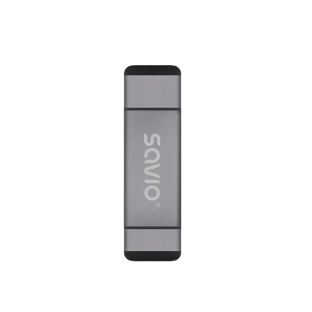 Czytnik 3w1 od Savio posiada trzy rodzaje złącz USB-C, USB-A oraz USB micro B. Dzięki temu możesz podłączyć go zarówno do starszych modeli telefonów, jak i nowoczesnych smartfonów w celu wymiany danych. Urządzenie to może służyć także jako uniwersalna pamięć flash typu pendrive i umożliwić podpięcie do różnych sprzętów, takich jak komputery czy telewizory.