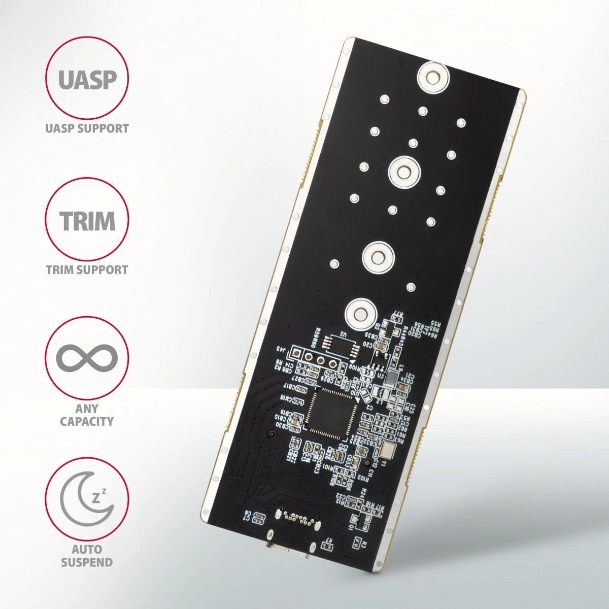 Żebrowana obudowa korpusu i podkładki przewodzące ciepło zapewniają bardzo dobre chłodzenie włożonego dysku SSD M.2. Wydłuża to jego żywotność, a także zapobiega spowalnianiu dysku, tzw. "Thermal Throttling". Solidny korpus obudowy chroni również dysk.