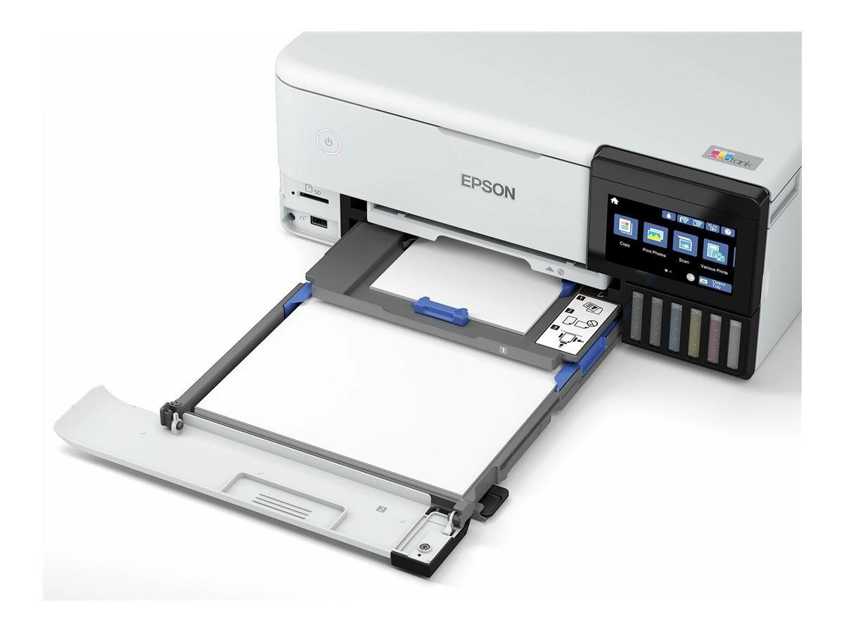 - Specjalistyczne funkcje do łatwego drukowania zdjęć i tekstu: Podajniki papieru dostosowane do formatu zdjęciowego i A4 oraz dwa tylne podajniki do grubszych podłoży i drukowania dwustronnego