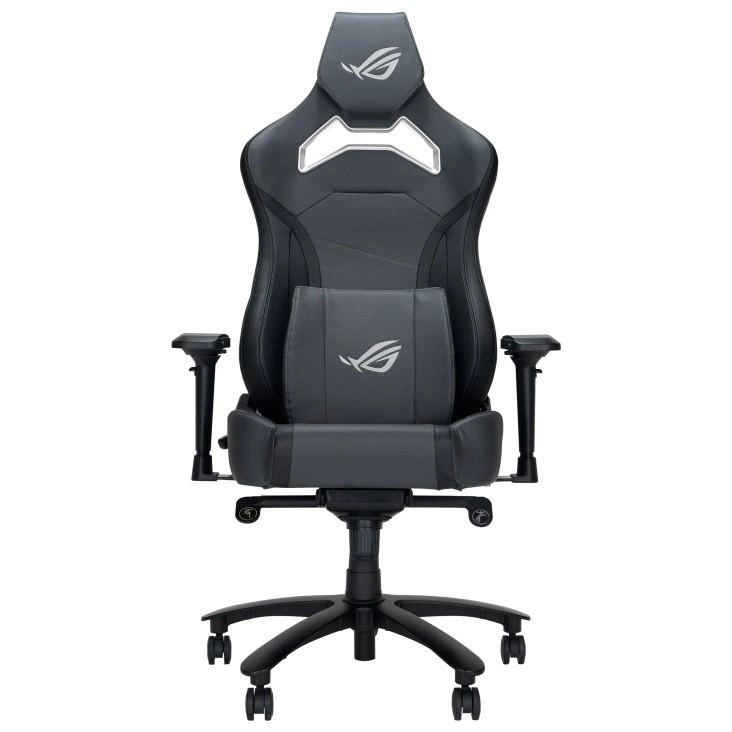 Fotel gamingowy ROG Chariot X Core w stylu samochodu wyścigowego, wyposażony w regulowany zagłówek z pianki o dużej gęstości, podparcie lędźwiowe z pianki zapamiętującej kształt, podłokietniki 4D, mechanizm przechylania, trwały podnośnik gazowy klasy 4 i trwałą, wysokiej jakości skórę PU zapewniającą najwyższej jakości wrażenia z gry.