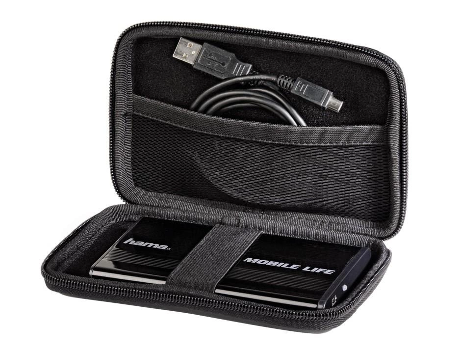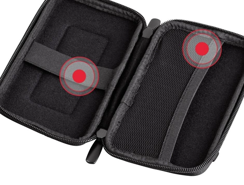 W tym sztywnym futerale zamontowano specjalną gumkę do stabilnego mocowania dysku. Poza dyskiem zmieszczą się tu także inne drobne akcesoria np. pamięć USB, kabel do transmisji danych, czy karty pamięci. Dzięki elastycznej kieszonce z siateczki wszystko jest dobrze uporządkowane i łatwo dostępne. Dla wygody użytkowania etui jest zamykane na dwukierunkowy zamek błyskawiczny.