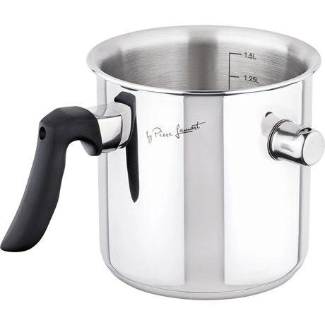 - Garnek do gotowania mleka jest wyprodukowany z wysokiej jakości stali z podwójną ścianką posiadającej właściwości termoakumulacyjne umożliwiającej szybkie rozprowadzanie ciepła i oszczędność energii.