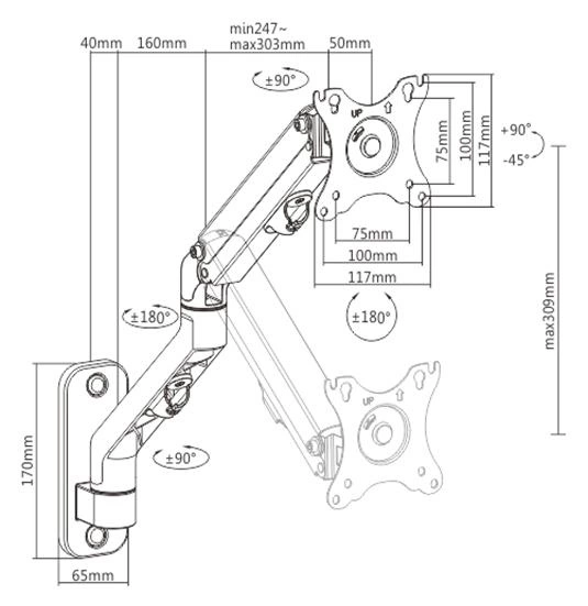 GEMBIRD BIURKOWE REGULOWANE RAMIĘ/UCHWYT NA MONITOR DO MONTAŻU NA ŚCIANIE 17-27, VESA 100X100MM, DO DO 7 KG