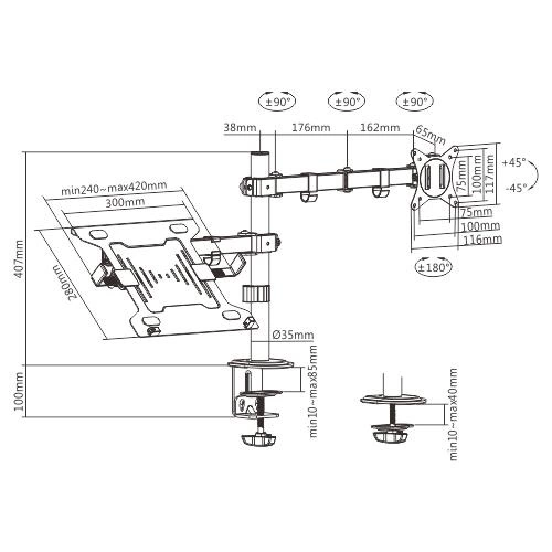 GEMBIRD BIURKOWE REGULOWANE RAMIĘ/UCHWYT Z RAMIENIEM NA MONITOR I PODSTAWKĄ NA NOTEBOOKA 17-32, 100X100MM, DO 9KG