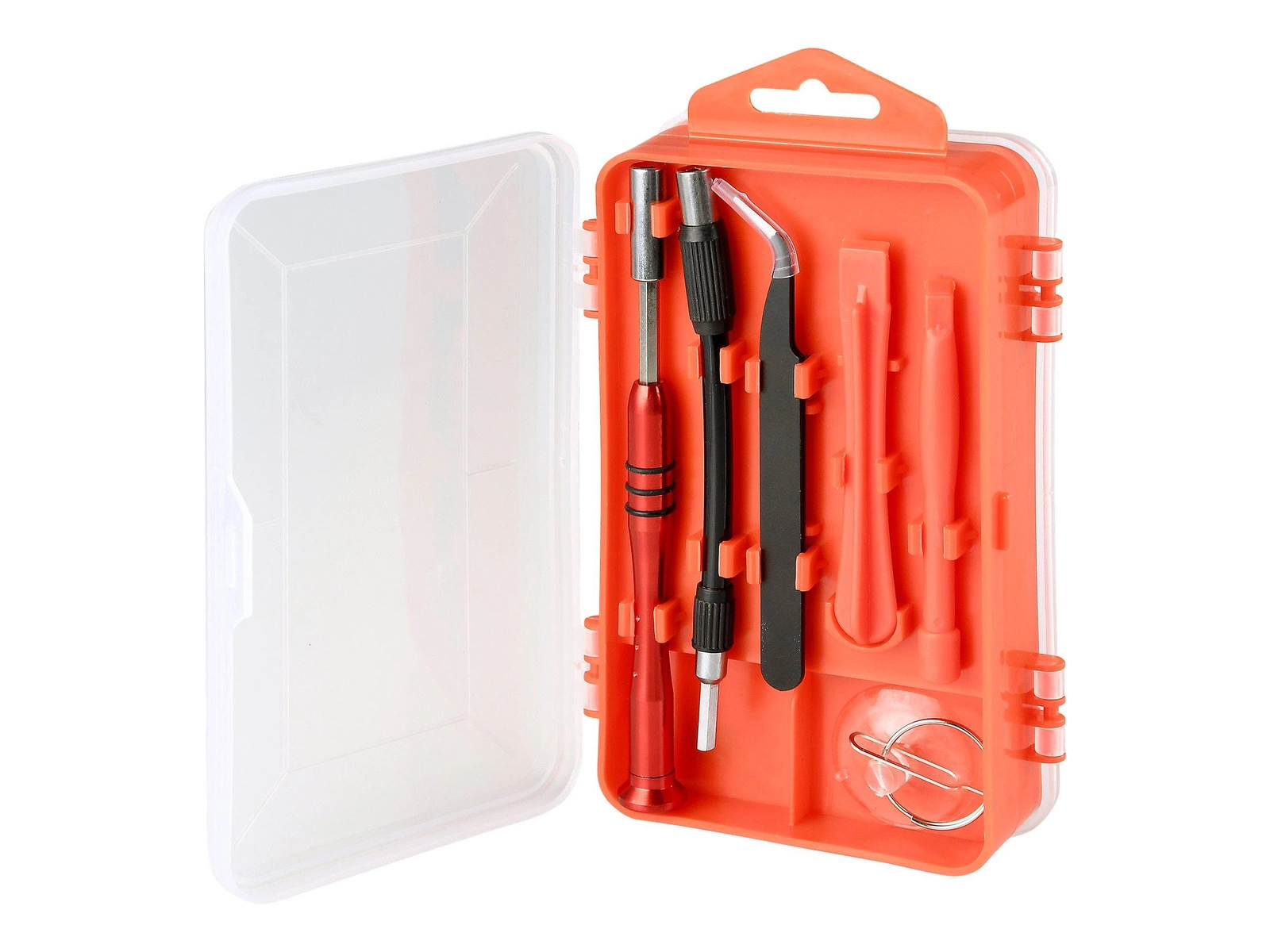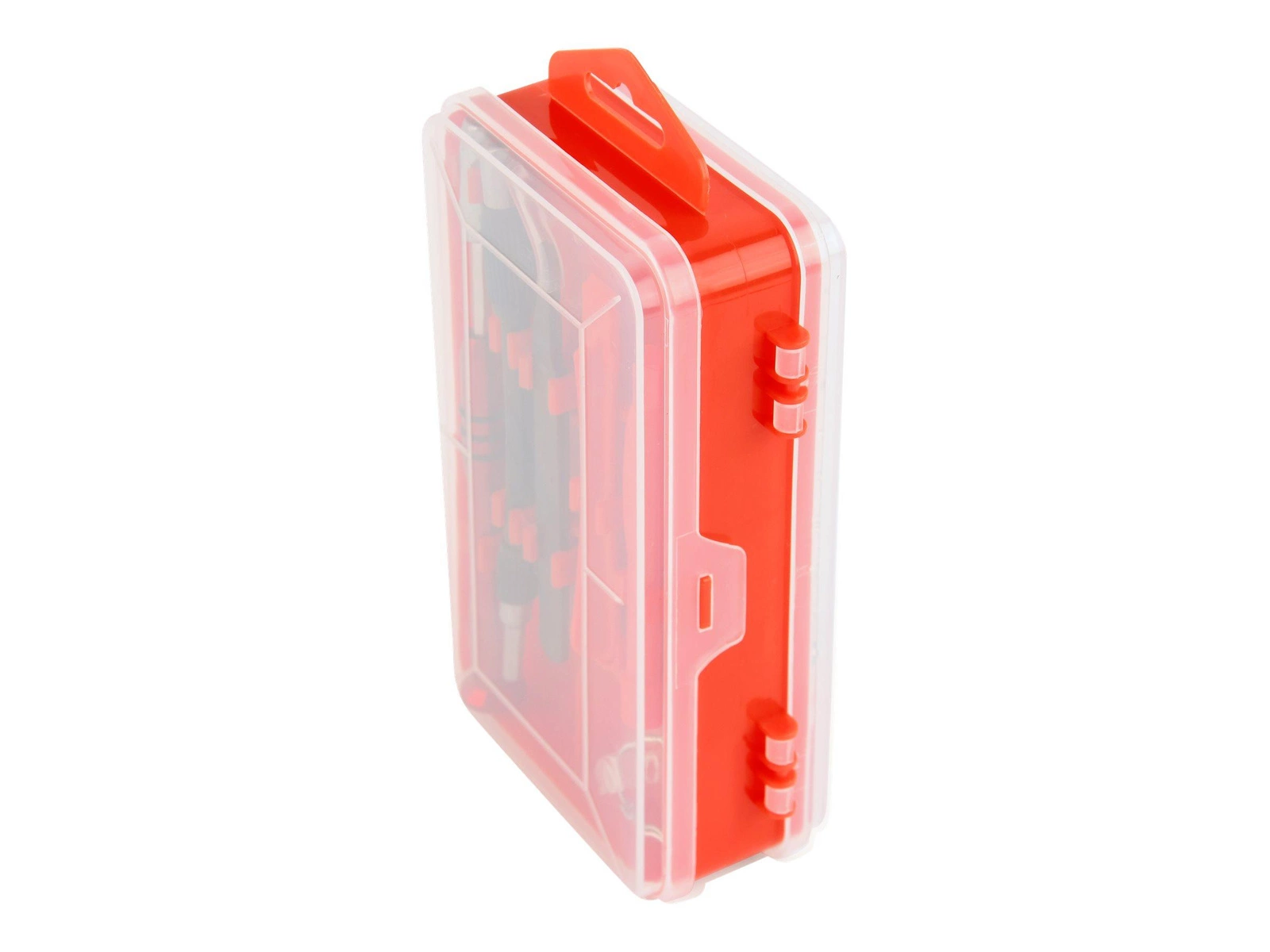 Uchwyt wkrętaka, pęseta, 7 końcówek wkrętaka - płaski 1, 1,5, 2, 2,5, 3, 3,5, 4 mm, 2 otwieraki, przyssawka, magnetyzer/demagnetyzer, pręt rozszerzenia, elastyczny wał przedłużający, trójkątny otwieracz obudów, szpilka, 8 gniazd - 2,5, 3, 3,5, 4 (x2), 4,5