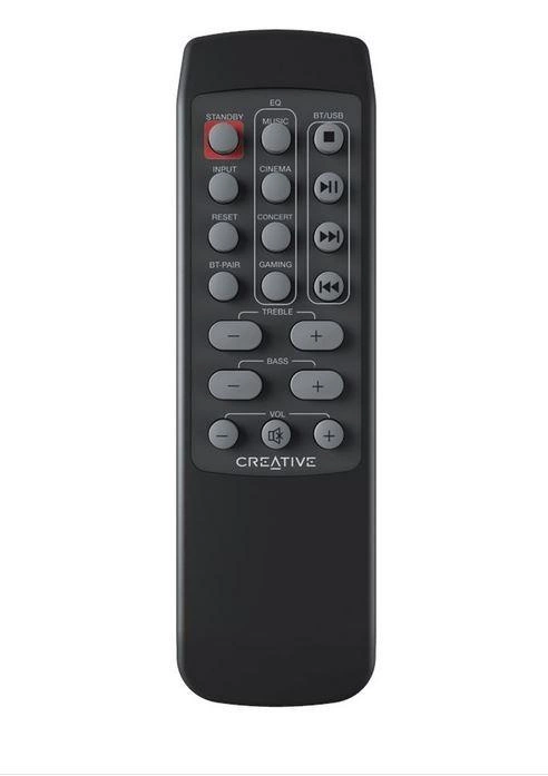 - Bezprzewodowy pilot z zaprogramowanymi ustawieniami korektora EQ i regulacją tonów niskich i wysokich.