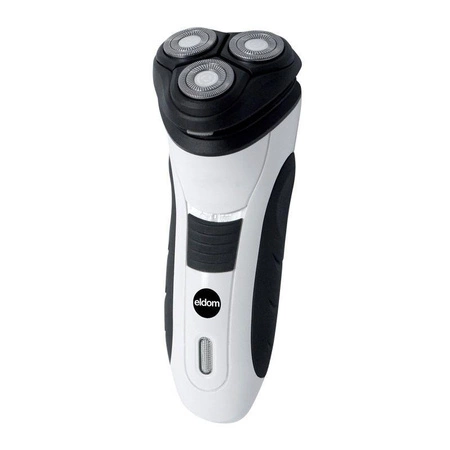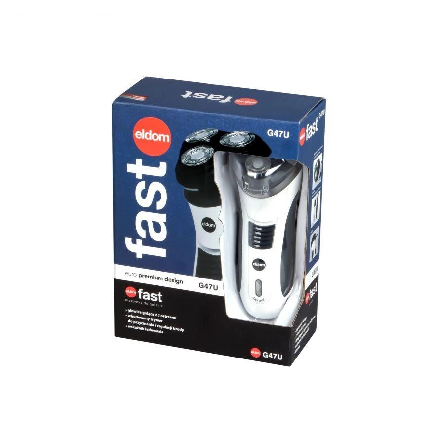 Golarka męska G47 marki Eldom, w kolorze biało-czarnym, zasilana akumulatorowo-sieciowo, z 3 głowicami golącymi. Model ten wyposażony jest w trymer oraz wskaźnik ładowania w toku. Golarka posiada ergonomiczną obudowę i można ją myć pod bieżącą wodą.