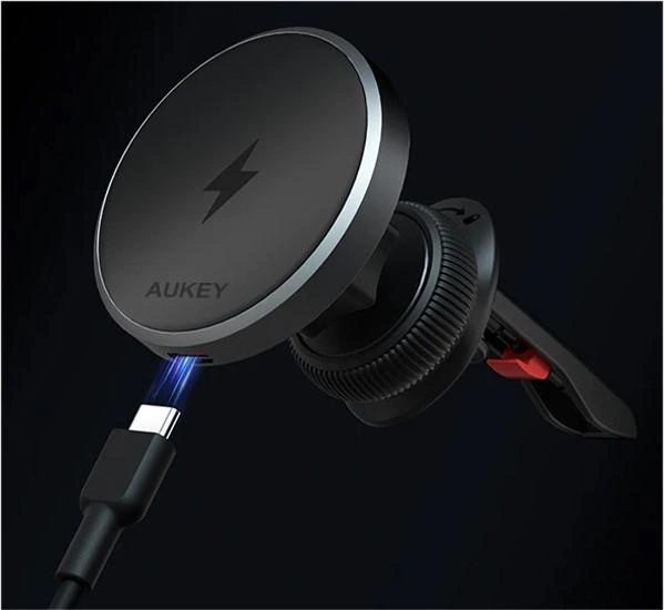 AUKEY HD-MC13 uniwersalny uchwyt magnetyczny z ładowarką bezprzewodową Qi2 15W do samochodowej kratki nawiewowej (BARDZO MOCNY) z dodatkowym zatrzaskiem + kabel AUKEY USB-C 1m