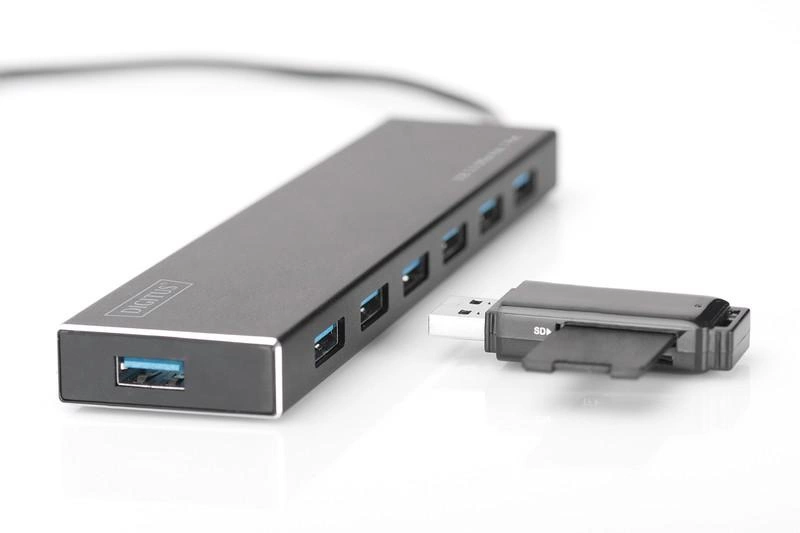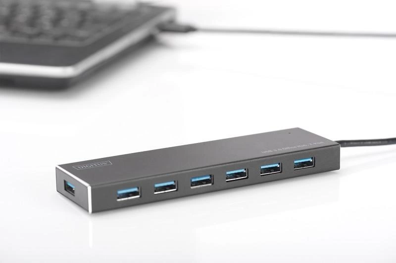 Hub biznesowy DIGITUS USB 3.0 stanowi idealne rozszerzenie każdego stanowiska pracy. Można podłączyć i używać do siedmiu urządzeń USB jednocześnie, dzięki czemu korzystanie z kilku urządzeń wejściowych lub pamięci przenośnych nie stanowi żadnego problemu. Dzięki technologii USB 3.0 przesył danych przebiega z prędkością do 5 Gbps, co gwarantuje szybką wymianę danych. Hub biznesowy DIGITUS USB 3.0 posiada wysokiej jakości obudowę aluminiową o subtelnym, ponadczasowym wzornictwie, które będzie pasować do każdego biurka.