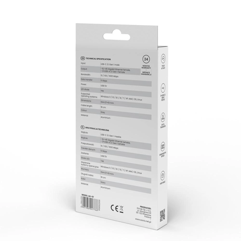 SAVIO AK-57 to nie tylko hub, ale również adapter, który jest idealnym rozwiązaniem dla laptopów i PC. Urządzenie posiada żeńskie gniazdo RJ-45 Gigabit Ethernet. Funkcja ta zapewnia stabilne i szybkie połączenie z Internetem z prędkością do 1000 Mbps.