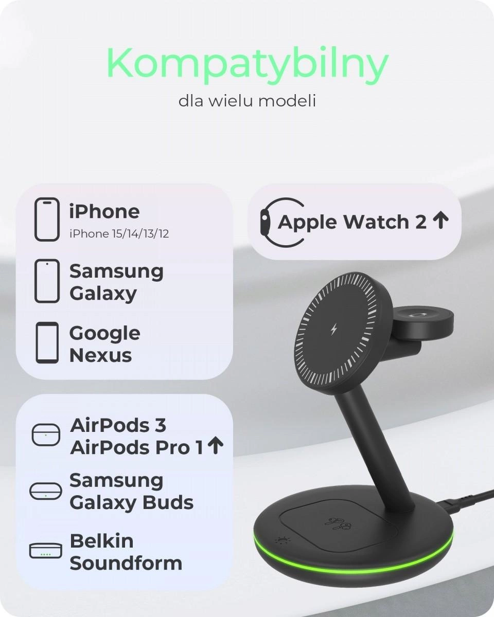 - Kompatybilność: Stacja ładująca jest kompatybilna z serią iPhone 15/14/13/12, serią Samsung Galaxy, Google Nexus i modelami innych producentów smartfonów, a także Apple Watch od serii 2 w górę i wieloma etui do ładowania słuchawek dousznych z serii AirPods 2, Samsung Galaxy Buds, Belkin Soundform itp.