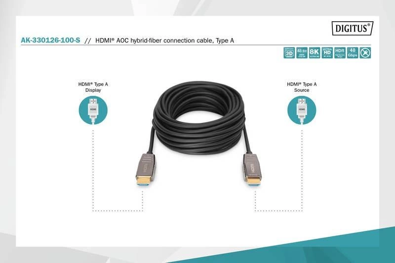 Ten aktywny hybrydowy kabel światłowodowy HDMI AOC jest idealny do przesyłania nieskompresowanego obrazu i dźwięku z dużą przepustowością na większe odległości. Hybrydowa struktura składająca się z przewodów miedzianych i światłowodowych eliminuje zakłócenia elektromagnetyczne, zapewniając bezstratną transmisję na całej długości kabla, z rozdzielczością UHD do 8K/60 Hz i przepustowością do 48 Gb/s. Ze względu na zastosowanie przewodów optycznych (włókna szklanego) średnica kabla jest niewielka i charakteryzuje się bardzo małymi promieniami gięcia i niską masą własną. Idealny do użytku w domu, salach konferencyjnych i w budynkach. Łatwa instalacja za pomocą funkcji Plug and Play. Obsługuje liczne standardy, takie jak HDMI 2.1, HDCP 2.2 lub HDR. Obszar audio obsługuje formaty ARC, DTS-HD Master Audio lub Dolby TrueHD, a także posiada wiele innych funkcji. Wykorzystanie najnowocześniejszej technologii chipowej umożliwia przesyłanie pełnego zakresu sygnału HDMI i obsługę CED, EDID z bardzo niskim opóźnieniem i bez kompresji.
