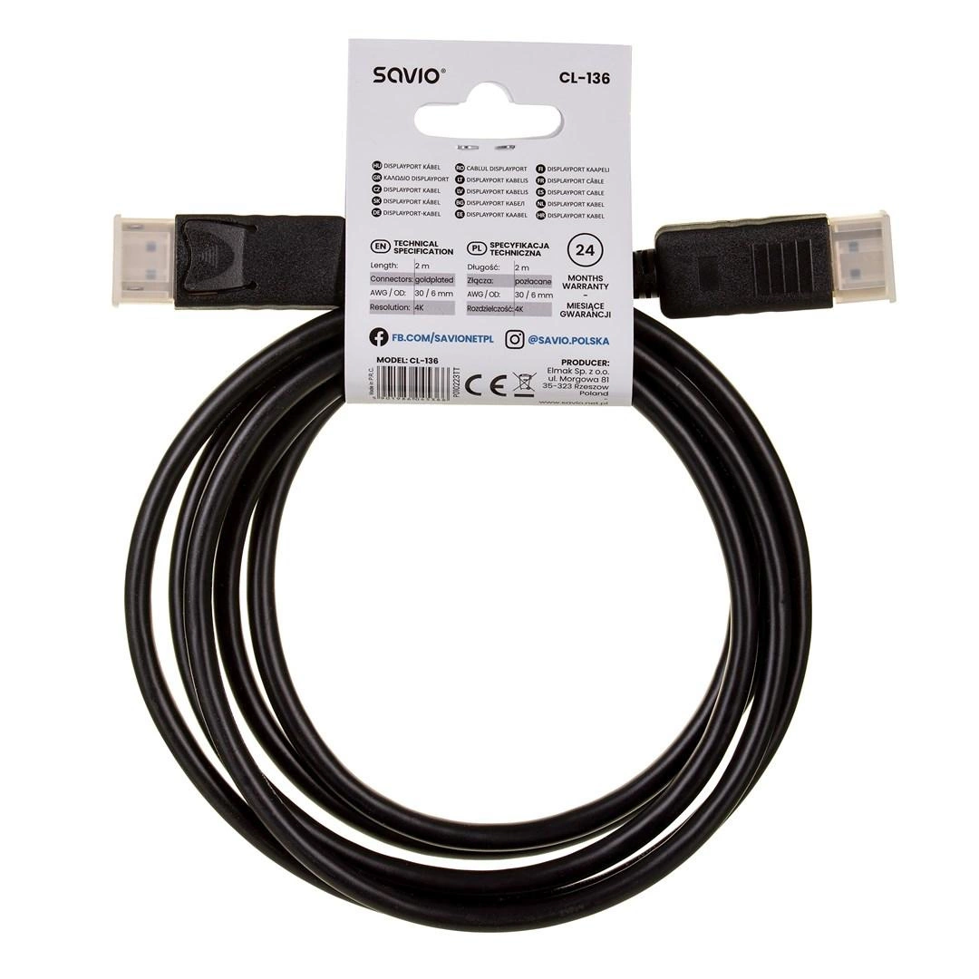 Kabel SAVIO CL-136 (DisplayPort M - DisplayPort M; 2m; kolor czarny)
