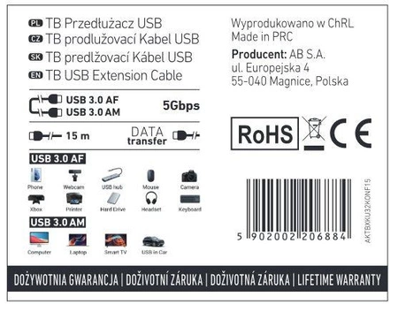 Przedłużacz przesyła dane w standardzie 3.0, z prędkością 5 Gbit/s (około 10 razy szybciej niż USB 2.0)
