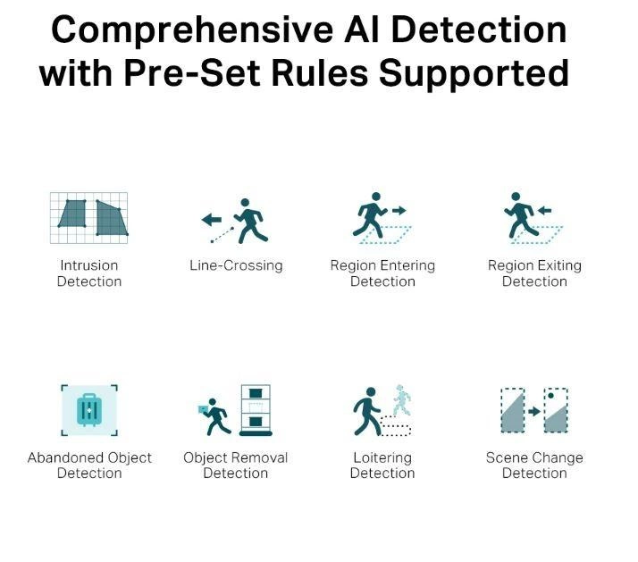 Zintegrowane układy AI obsługują zaawansowane algorytmy odróżniające ludzi i pojazdy od innych obiektów. Możesz elastycznie dostosowywać reguły alarmów do swoich potrzeb w zakresie monitorowania i otrzymywać dokładniejsze powiadomienia o zdarzeniach.