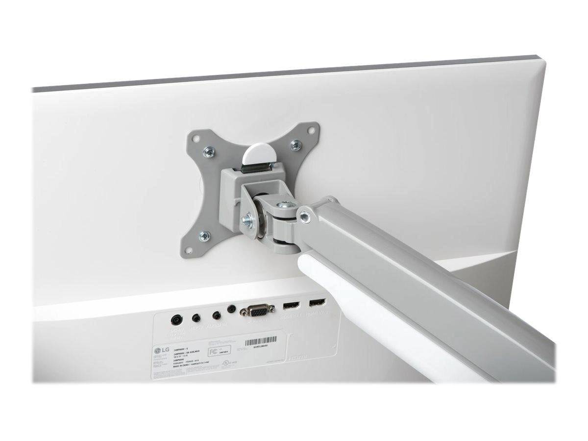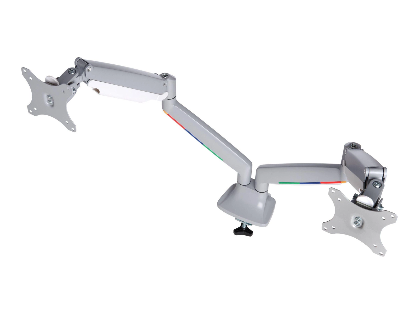 - Regulowane ramiona One-Touch z wysięgnikami gazowymi ułatwiają dostosowanie wysokości (w zakresie 6,7–19,9" lub 170–505mm), pozwalają na zmianę pochylenia monitorów w lewo i prawo iobracanie ich wzakresie ±180°, atakże zmianę ich nachylenia o ±90°. Umożliwiają też płynną regulację położenia monitorów w dowolnym kierunku, wpełnym zakresie ruchów wysięgników.