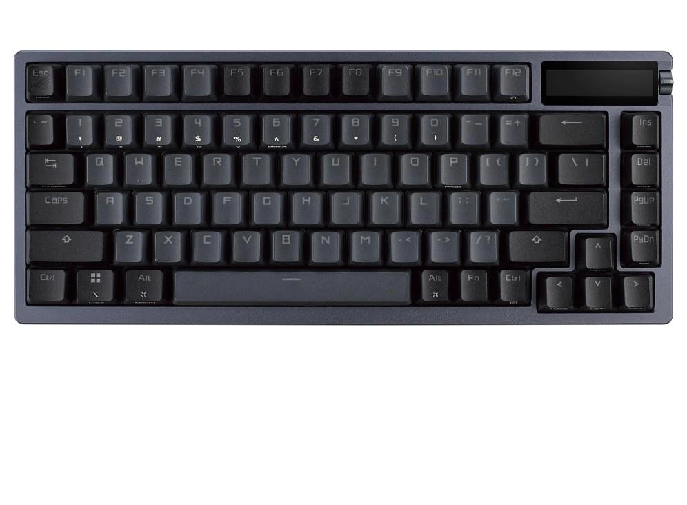 Niestandardowa klawiatura do gier ROG Azoth o współczynniku kształtu 75, mocowaniu na uszczelkę, trójwarstwowej piance tłumiącej i metalowej górnej pokrywie, wysoce konfigurowalna dzięki wstępnie nasmarowanym przełącznikom mechanicznym ROG NX z możliwością wymiany podczas pracy, stabilizatorom klawiatury ROG, podwójnym nasadkom klawiszy z PBT i zestawowi smarowania, trzy -tryb połączenia z technologią 2,4 GHz SpeedNova, wyświetlaczem OLED, trójkierunkowym pokrętłem sterującym, trzema kątami nachylenia i obsługą komputerów Mac
