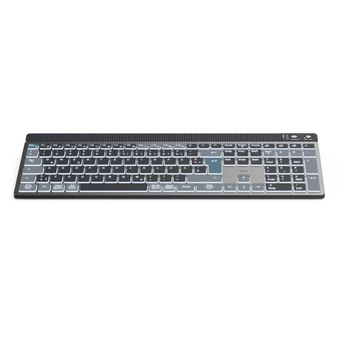 Klawiatura bezprzewodowa Hama WK-750 oferuje wszechstronną łączność multi-device, umożliwiając jednoczesne podłączenie do trzech urządzeń (1 USB, 2 Bluetooth) i szybkie przełączanie między nimi za pomocą przycisku. Stabilne połączenie 2,4 GHz oraz Bluetooth 5.2 zapewnia swobodę użytkowania na odległość do 10 metrów.
