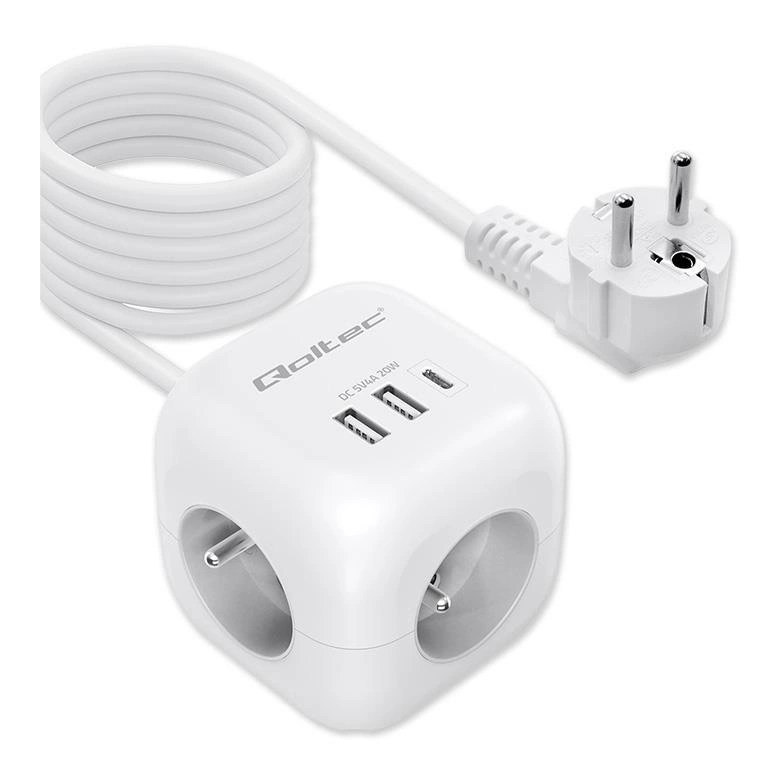 Kostka zasilająca Qoltec przedłużacz 6w1 z podświetlanym włącznikiem | 3x AC | 2x USB | 1x USB-C PD 20W | Biała | Kabel 2m