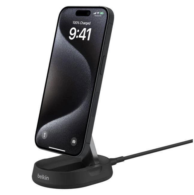 Szybko ładuj iPhone'a lub inne urządzenie kompatybilne z Qi2 mocą do 15 W. Technologia Qi2 optymalizuje zużycie energii i chroni żywotność baterii urządzenia. Użyj regulowanego pochylenia w trybie podkładki lub stojaka. Użytkownicy Apple mogą skorzystać z kompatybilności w trybie gotowości.