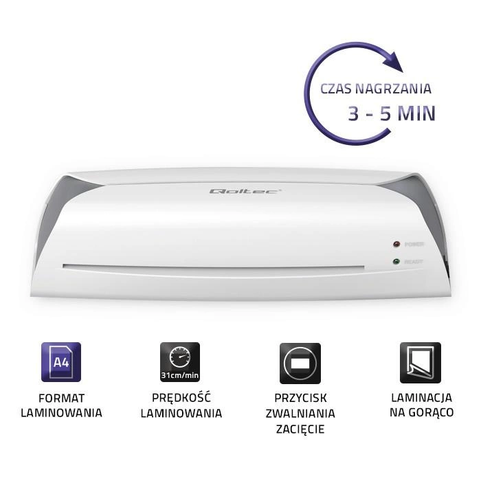 Laminator Qoltec to gwarancja szybkiej i bezproblemowej laminacji dokumentów. Jest idealnym rozwiązaniem w miejscach, gdzie ważna jest jakość i estetyka przechowywanych dokumentów. Ponadto oferuje: