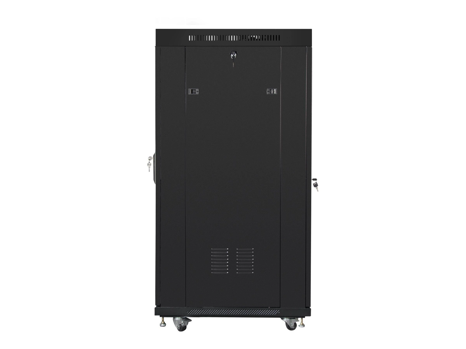 20 x nakrętka klatkowa M6, szyny montażowe, panel wejściowy kabla dolnego, zamek drzwiowy przedni i tylny, nogi poziomujące, koła z hamulcem, panel wentylacyjny (4 wentylatory), blokady boczne, górny panel wejściowy kabla