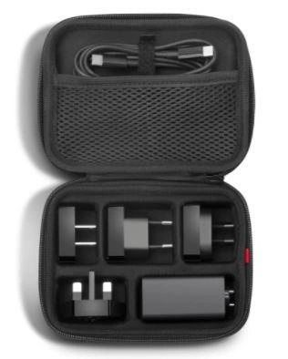 Wygodny pokrowiec dla podróżujących, zasilacz podróżny Lenovo 65 W USB C, kabel USB C do USB C, pakiet gwarancyjny, podręcznik szybkiej obsługi, cztery wymienne wtyczki: