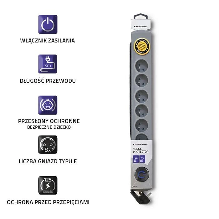 Listwa antyprzepięciowa | Quick Switch | 8 gniazd | 3m | szara