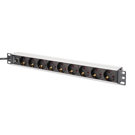 Listwa zasilająca DIGITUS PDU Rack 19" z bezpiecznikiem przeciążeniowym, 9 gniazd Schuko CEE 7/3 (45°), kabel 2m wtyk IEC C14, 10A, aluminiowa