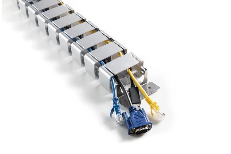 Elastyczna prowadnica kabli DIGITUS jest idealnym rozwiązaniem do biurek z regulacją wysokości i biurek wolnostojących. Poszczególne elementy można usuwać lub dodawać, dzięki temu dopasować jej długość do wysokości stołu. Podczas opuszczania stołu o regulowanej wysokości, prowadnica się składa, zapobiegając plątaniu kabli, podczas gdy obciążana metalowa podstawa utrzymuje stabilność na podłodze. W prowadnicy dostępne są 4 oddzielne kanały do układania kabli. Każdy moduł posiada elastyczny otwór umożliwiający łatwe wprowadzanie i wyprowadzanie kabli.