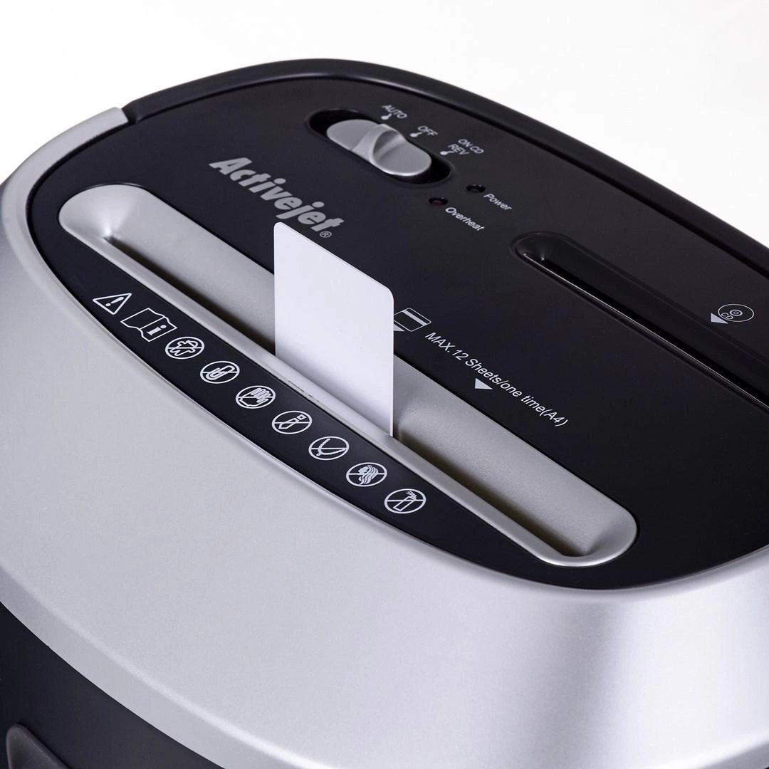 Niszczarka Activejet ASH-1201D, P-3, 25 l, ścinki 5x38 mm, 12 kartek, czarno-srebrna.