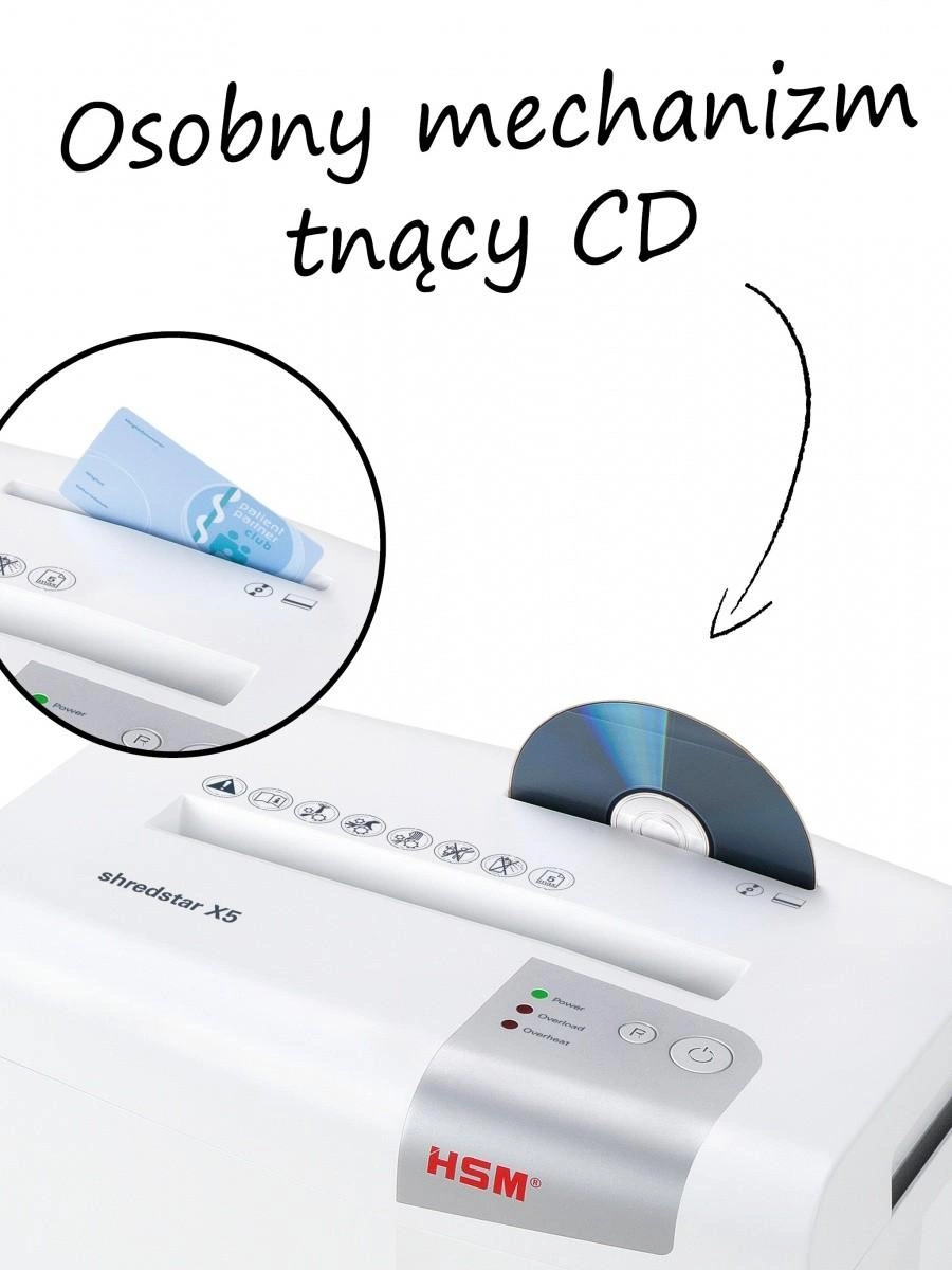 - Oddzielny mechanizm tnący płyty CD z pojemnikiem na ścinki umożliwiającym segregację odpadów