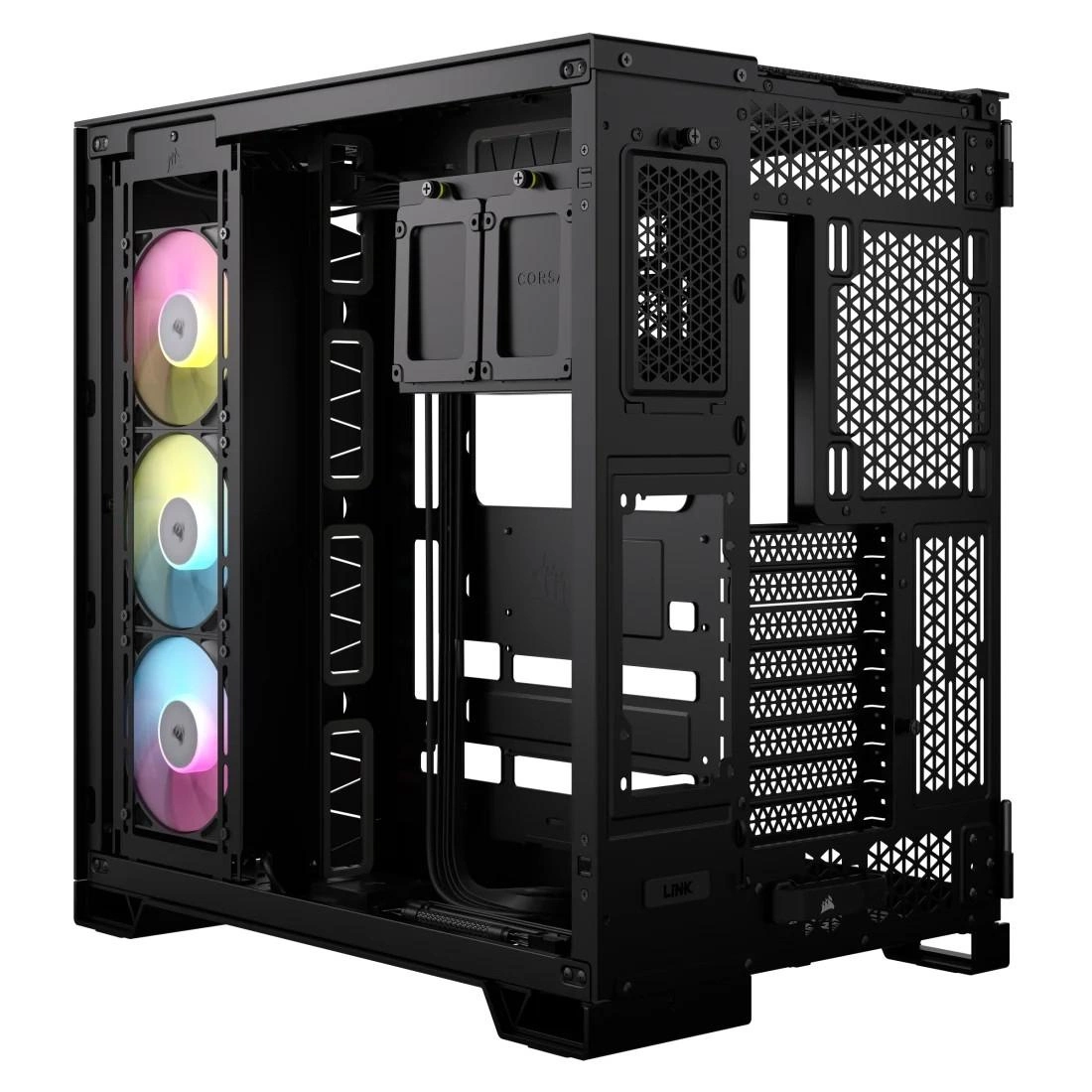 Obudowa komputera Mid-Tower z dwiema komorami CORSAIR iCUE LINK 6500X RGB umożliwia budowę schludnego komputera SFF, którego wnętrze z dwoma instalowanymi fabrycznie wentylatorami RX120 RGB można podziwiać przez trzy panele ze szkła hartowanego.