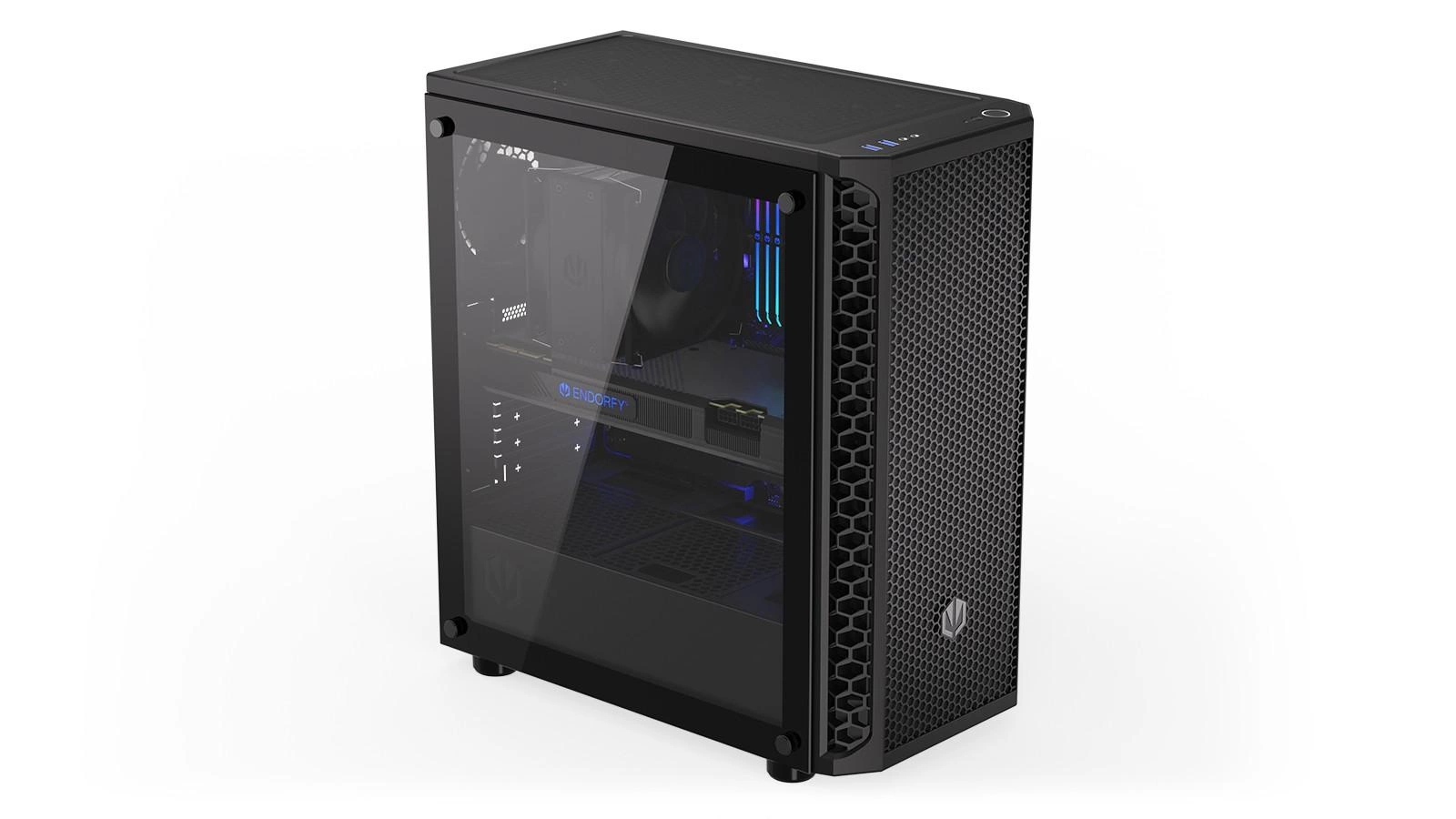 ENDORFY Signum 300 Core to zgrabna (413×447×216 mm) obudowa, w której Twoje komponenty poczują się jak w przewiewnym domu. Bezpiecznie trzyma podzespoły w przyjemnym chłodku, a do tego wygląda tak dobrze, że zechcesz powiesić jej zdjęcie nad łóżkiem. No ale czego innego można się spodziewać po boku z hartowanego szkła i na maksa pojemnym wnętrzu, prawda?