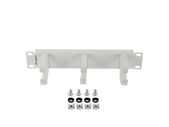Organizer kabli 1U typu B marki Lanberg pasujący do szaf 10", wyposażony w 3 metalowe uchwyty służące do prowadzenia przewodów.