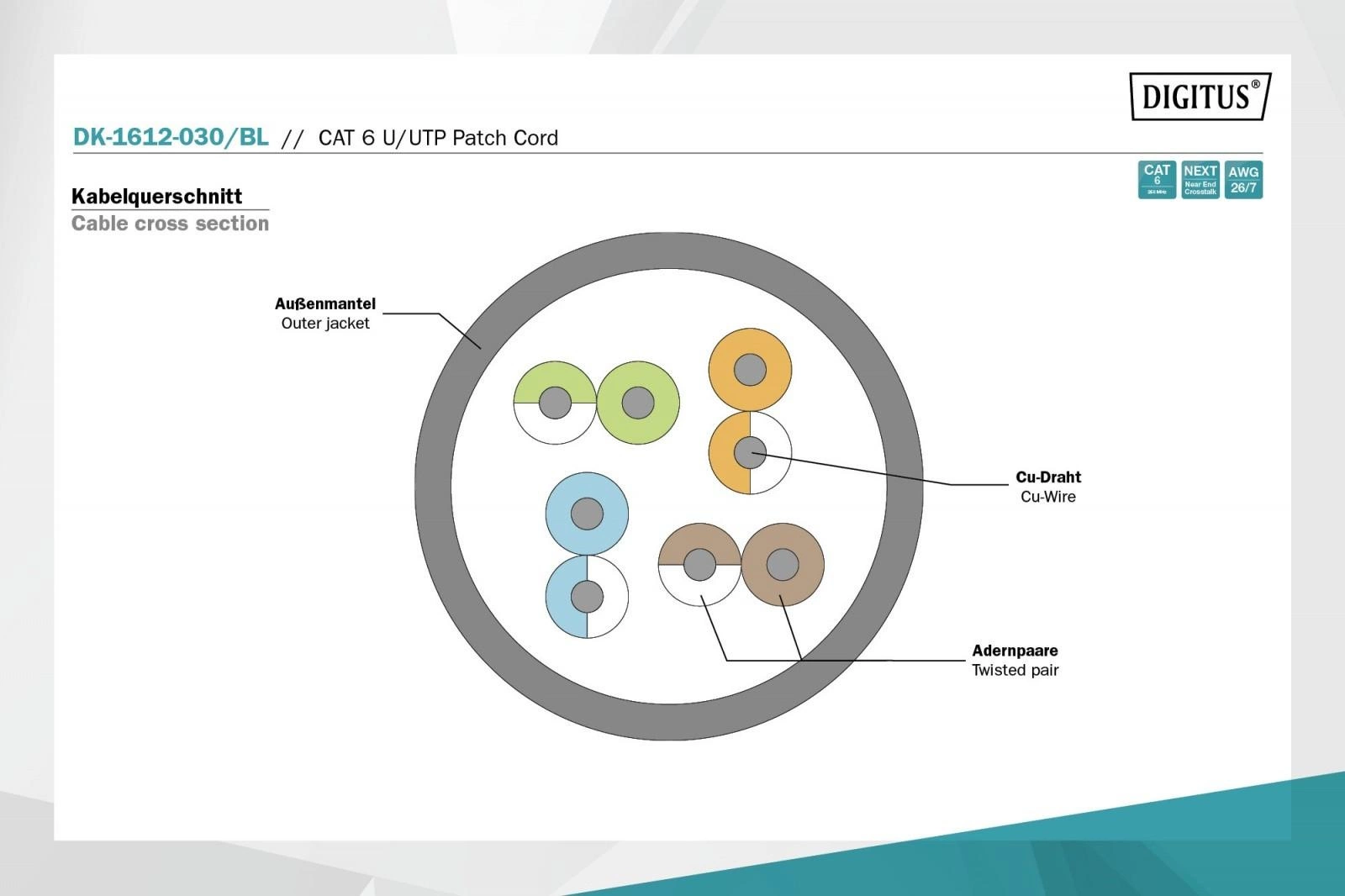 Kable połączeniowe DIGITUS kategorii 6 klasy E są produkowane i testowane według standardu ISO/IEC 11801 oraz DIN EN 50173 CAT 6. Gwarantują, że instalacja kablowa będzie odpowiadać specyfikacji kanałów ISO & EN, i zapewniają znakomitą sprawność w okablowaniu DIGITUS CAT 6. Sprawność została przetestowana do 250 MHz, włącznie z właściwościami związanymi ze sprawnością, jak na przykład przesłuchem (NEXT). Kable połączeniowe DIGITUS zostały specjalnie zaprojektowane, aby sprostać w pełnym zakresie wszelkim wymogom w przypadku różnych zastosowań. Każdy kabel posiada zalaną tulejkę odgiętki z uchwytem kablowym odciążającym. Poza tym tulejka posiada zabezpieczenie zapadki, które zapobiega zahaczaniu kabli i złamaniu się zapadki. Prostą identyfikację kategorii 6 umożliwia czerwona kolorystyka wtyczek.