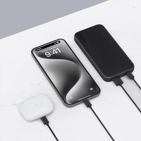 Powerbank Aukey został wyposażony w dwa gniazda: USB-A i USB-C. Umożliwia ładowanie dwóch baterii jednocześnie. W powerbanku zastosowano szereg zabezpieczeń, które chronią baterię w trakcie ładowania. To między innymi zabezpieczenie przed przeładowaniem, przepięciami oraz przegrzaniem.