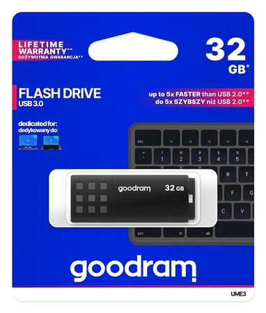 UME3 to klasyczny design, przełamany intensywnością kolorów obudowy. Zatyczka z wypukłym antypośligowym wzorem ułatwia otwarcie USB w każdej sytuacji. Po zdjęciu zatyczki można ją nałożyć na drugi koniec obudowy daje to pewność, że się nie zgubi. Idealnym rozwiązanie dla tych, którzy lubią mieć pamięci USB zawsze przy sobie, jest perforacja umożliwiająca przypięcie zawieszki. Pamięć UME3 dostępna jest w pojemnościach od 16 GB do 128 GB. Użyte komponenty pozwalają uzyskać prędkości odczytu do 60 MB/s i zapisu do 20 MB/s. Podobnie jak wszystkie inne pamięci USB marki GOODRAM, UME3 objęty jest dożywotnią gwarancją producenta.