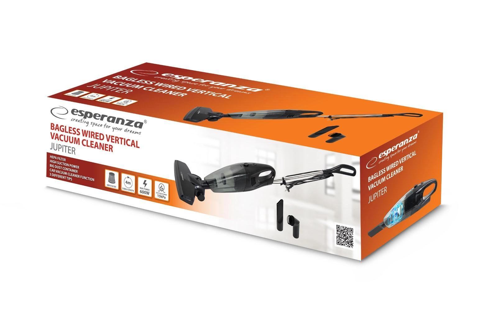 Esperanza JUPITER to nowoczesny, przewodowy odkurzacz pionowy, który został zaprojektowany z myślą o szybkim i skutecznym sprzątaniu wszystkich rodzajów podłóg. Dzięki lekkiej konstrukcji, wygodnemu uchwytowi i wymiennemu filtrowi HEPA doskonale sprawdza się w codziennym użytkowaniu. Silne ssanie pozwala łatwo usunąć kurz, okruchy i sierść zwierząt domowych, a funkcja ręcznego odkurzacza umożliwia wygodne czyszczenie schodów, tapicerki czy trudno dostępnych miejsc. Wytrzymałe metalowe ramię oraz pełny uchwyt zapewniają komfort i trwałość, a 4-metrowy przewód daje swobodę ruchu bez konieczności częstego przepinania kabla. Prosta obsługa za pomocą jednego przycisku oraz łatwy w opróżnianiu zbiornik o pojemności 0.8 l sprawiają, że sprzątanie staje się szybkie i wygodne.