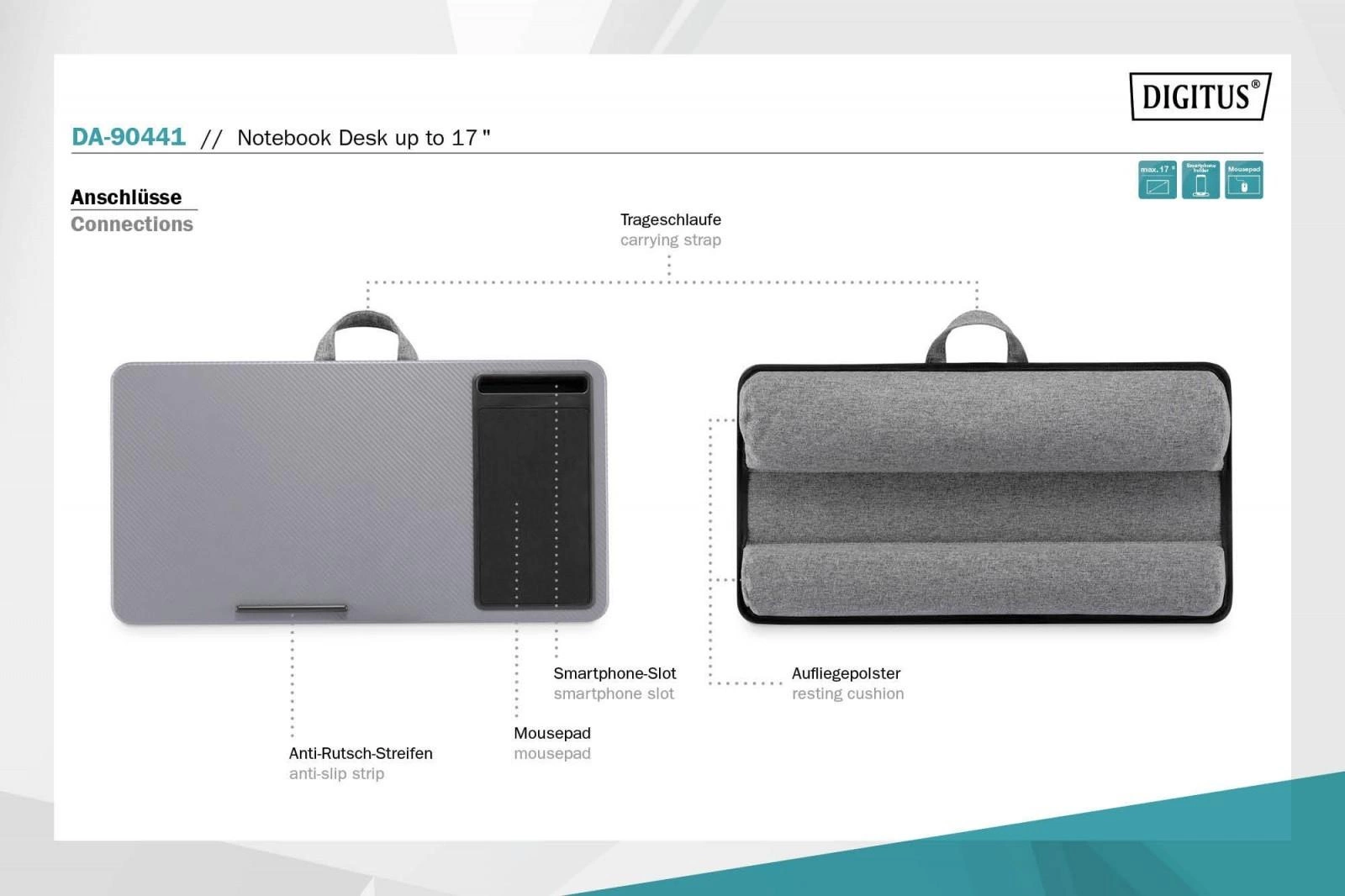 Stojak do notebooka umożliwia pracę w dowolnym miejscu a przez to maksymalną elastyczność. Uchwyt na spodzie zapobiega wyślizgiwaniu się notebooka nawet podczas pracy w pozycji nachylonej. Miękkie podkładki na spodzie zapewniają wygodne użytkowanie i stabilne oparcie.