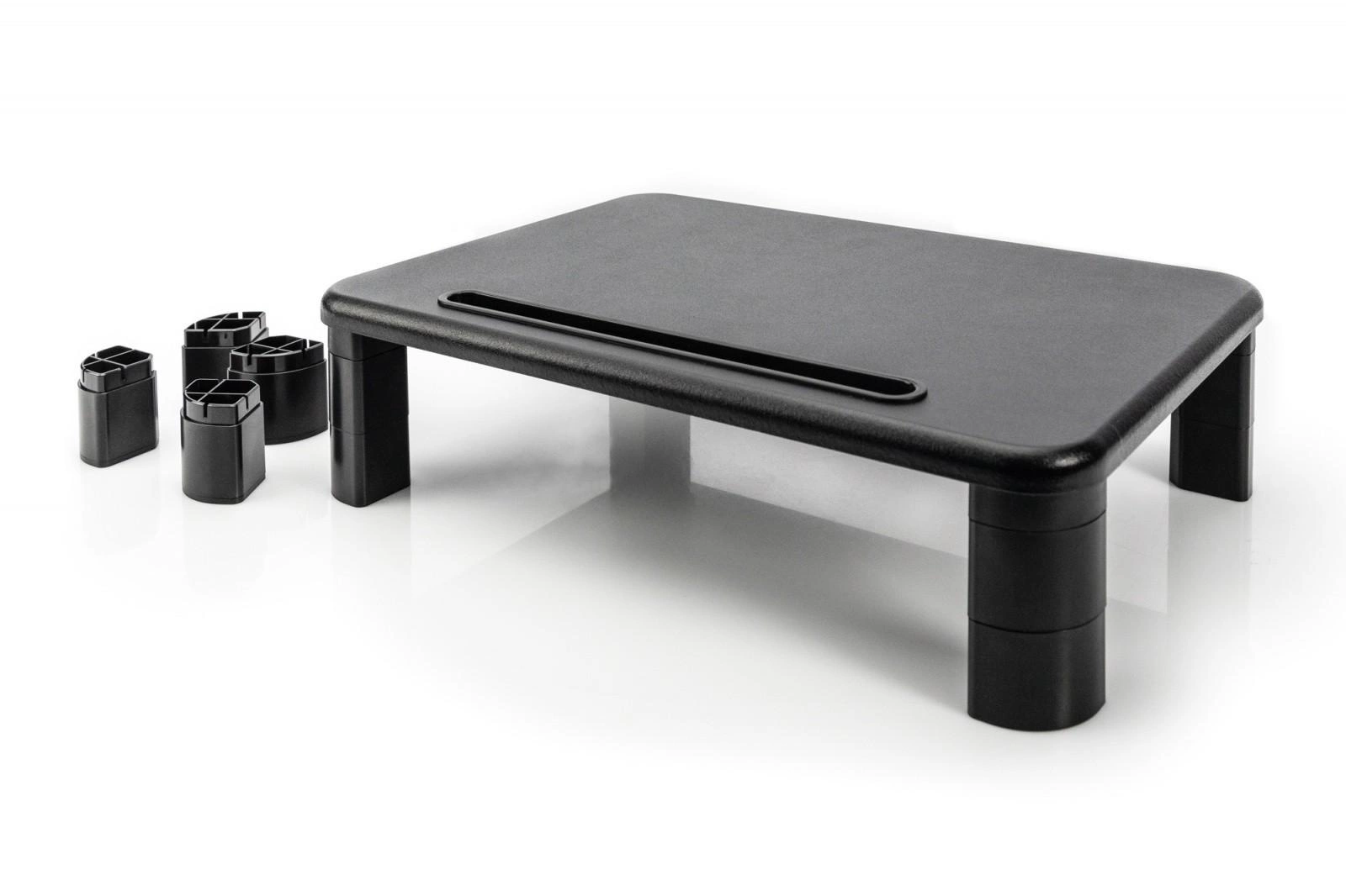 Regulowane podwyższenie monitora pomaga w indywidualnym zaprojektowaniu miejsca pracy. Dzięki modułowej konstrukcji nóżek można elastycznie zwiększyć wysokość w 3 krokach i odstawić tablet lub smartfon na przedniej części.