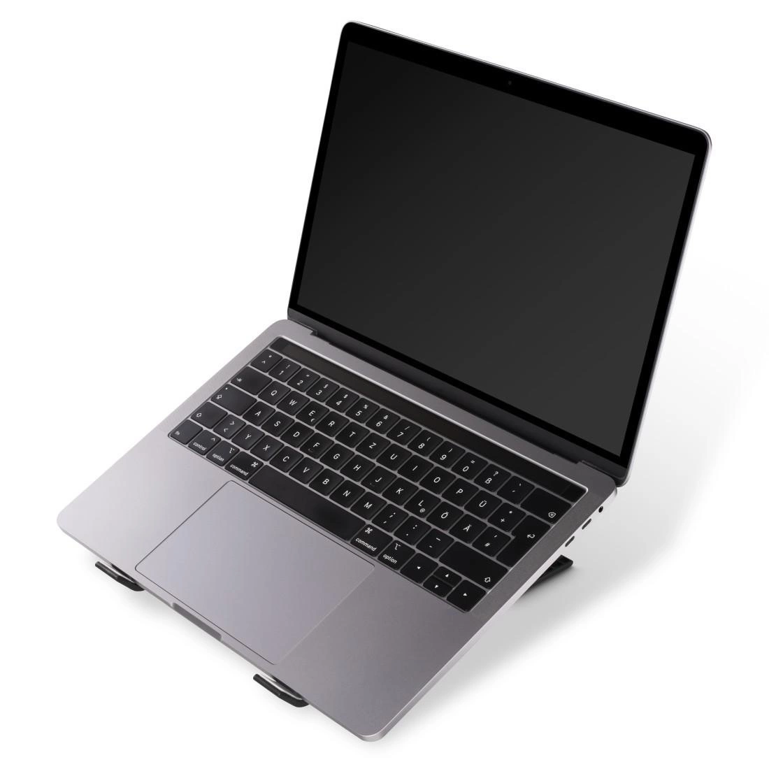 Możliwość elastycznej regulacji pionowego kąta nachylenia pozwala na ergonomiczną pracę przy laptopie na siedząco lub stojąco - Antypoślizgowe gumowe podkładki