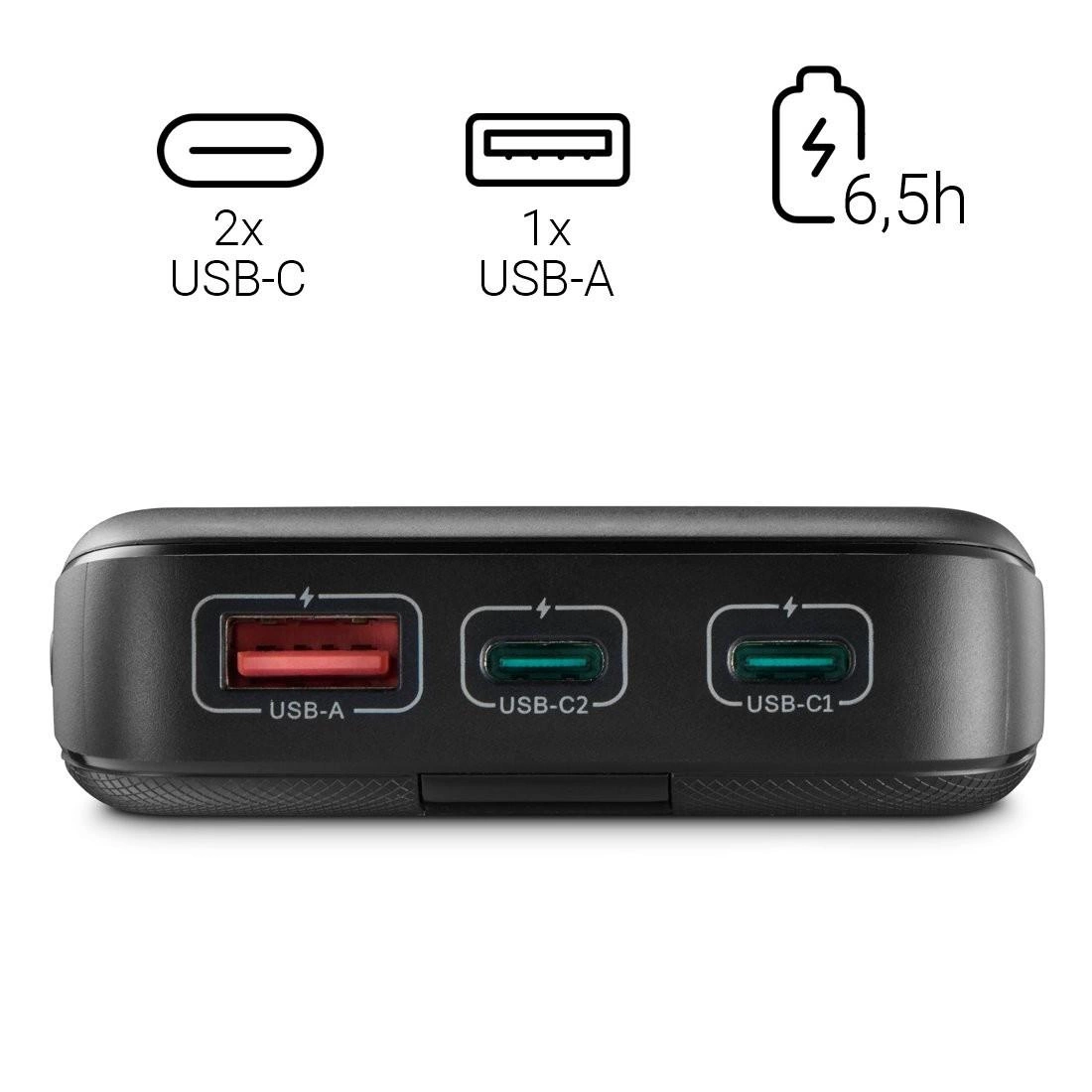Nasz powerbank umożliwia ładowanie aż trzech urządzeń jednocześnie (2 x USB-C, 1 x USB-A). Dzięki temu możesz naładować swój telefon, tablet oraz smartwatch w tym samym czasie, co jest idealnym rozwiązaniem w podróży czy podczas intensywnego dnia.