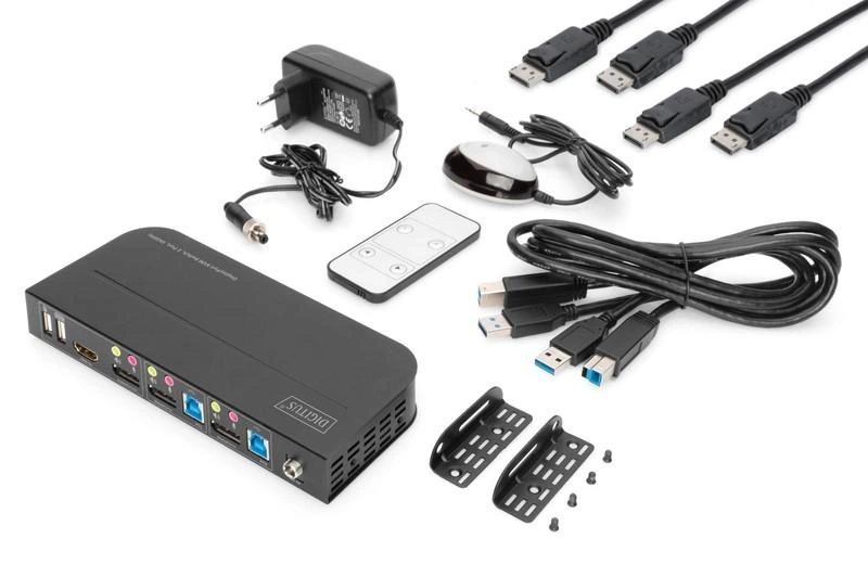 Za pomocą 2-portowego przełącznika KVM DIGITUS można obsługiwać dwa komputery PC z obsługą 4K przy użyciu jednej klawiatury USB i myszy. Za pomocą jednego przycisku lub dołączonego pilota zdalnego sterowania można łatwo przełączać się między dwoma komputerami i oszczędzić sobie kłopotu z podłączeniem kabli. Wyjście do monitora odbywa się za pośrednictwem zintegrowanego wyjścia HDMI lub DisplayPort. Sygnały audio z mikrofonu i głośnika również mogą być przełączane. Ponadto na panelu przednim znajdują się dwa porty USB 3.0, które mogą być wykorzystane do podłączenia dodatkowych urządzeń peryferyjnych, takich jak pamięci USB lub zewnętrzne dyski twarde w obu komputerach. Jeśli przełącznik KVM zostanie umieszczony w niedostępnym miejscu, można użyć dołączonego do zestawu odbiornika podczerwieni wraz z kablem połączeniowym, bez konieczności umieszczania samego przełącznika KVM w zasięgu pilota. Diody LED z informacją o stanie na przednim panelu przełącznika pokazują przez cały czas aktualną konfigurację. Wąski wyłącznik uzupełniają solidna metalowa obudowa i możliwość montażu na ścianie.