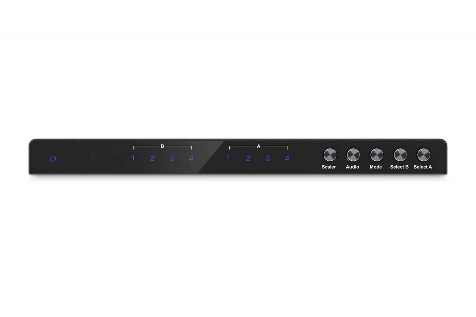 - Muli-Viewer: 6 trybów do indywidualnego wyświetlania źródeł sygnału na wyjściu HDMI A (główne) lub jednocześnie na wyjściu HDMI A i B (wtórne) za pomocą pilota zdalnego sterowania lub przycisków na samym urządzeniu